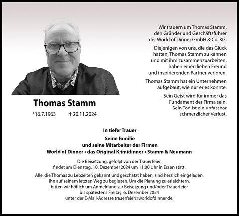 Wir bedanken uns herzlich bei allen Freunden, Bekannten und Mitarbeitern, die sich die Zeit genommen haben, Thomas Stamm die letzte Ehre zu erweisen.